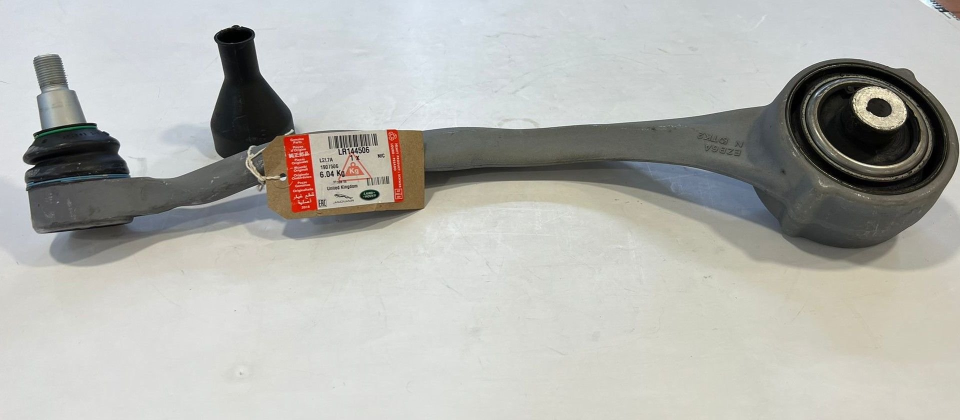 LR144506 is a Land Rover part number for a left front lower control arm. It is compatible with Land Rover Defender (L663) and Discovery V (L462) models. The part is also known as a front lower arm, suspension control arm, or wishbone